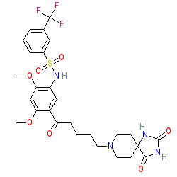 | SMILES | COc1cc(OC)c(C(=O)CCCCN2CCC3(CC2)NC(=O)NC3=O)cc1NS(=O)(=O)c1cccc(C(F)(F)F)c1 |
