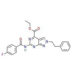 | SMILES | CCOC(=O)c1nc(NC(=O)c2ccc(F)cc2)nc2nn(CCc3ccccc3)cc12 |