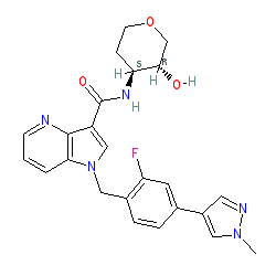 | SMILES | Cn1cc(-c2ccc(Cn3cc(C(=O)N[C@H]4CCOC[C@@H]4O)c4ncccc43)c(F)c2)cn1 |
