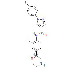 | SMILES | O=C(Nc1ccc([C@H]2CNCCO2)cc1F)c1cnn(-c2ccc(F)cc2)c1 |