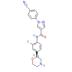 | SMILES | N#Cc1ccc(-n2cc(C(=O)Nc3ccc([C@H]4CNCCO4)cc3F)cn2)cc1 |