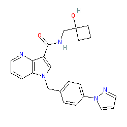 | SMILES | O=C(NCC1(O)CCC1)c1cn(Cc2ccc(-n3cccn3)cc2)c2cccnc12 |