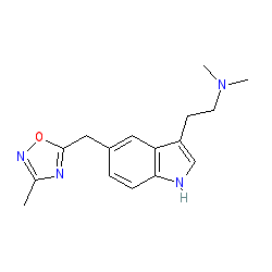 | SMILES | Cc1noc(Cc2ccc3[nH]cc(CCN(C)C)c3c2)n1 |