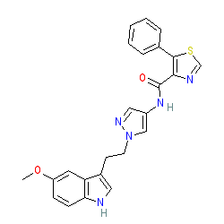 SMILES | COc1ccc2[nH]cc(CCn3cc(NC(=O)c4ncsc4-c4ccccc4)cn3)c2c1 |