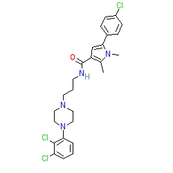 | SMILES | Cc1c(C(=O)NCCCN2CCN(c3cccc(Cl)c3Cl)CC2)cc(-c2ccc(Cl)cc2)n1C |