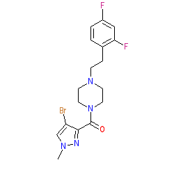 | SMILES | Cn1cc(Br)c(C(=O)N2CCN(CCc3ccc(F)cc3F)CC2)n1 |