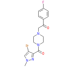 | SMILES | Cn1cc(Br)c(C(=O)N2CCN(CC(=O)c3ccc(F)cc3)CC2)n1 |