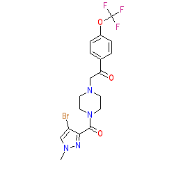 | SMILES | Cn1cc(Br)c(C(=O)N2CCN(CC(=O)c3ccc(OC(F)(F)F)cc3)CC2)n1 |