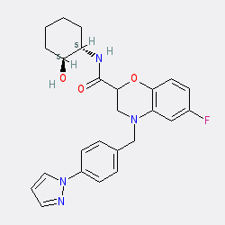 | SMILES | O=C(N[C@H]1CCCC[C@@H]1O)C1CN(Cc2ccc(-n3cccn3)cc2)c2cc(F)ccc2O1 |