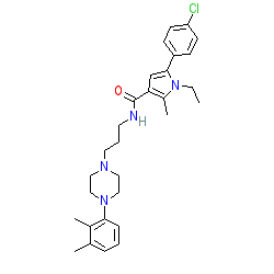 | SMILES | CCn1c(-c2ccc(Cl)cc2)cc(C(=O)NCCCN2CCN(c3cccc(C)c3C)CC2)c1C |