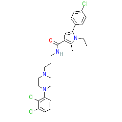 | SMILES | CCn1c(-c2ccc(Cl)cc2)cc(C(=O)NCCCN2CCN(c3cccc(Cl)c3Cl)CC2)c1C |