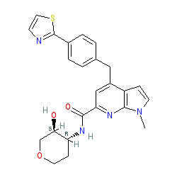 | SMILES | Cn1ccc2c(Cc3ccc(-c4nccs4)cc3)cc(C(=O)N[C@@H]3CCOC[C@H]3O)nc21 |