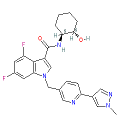 | SMILES | Cn1cc(-c2ccc(Cn3cc(C(=O)N[C@H]4CCCC[C@@H]4O)c4c(F)cc(F)cc43)cn2)cn1 |