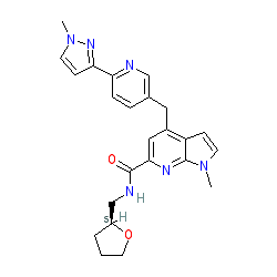 | SMILES | Cn1ccc(-c2ccc(Cc3cc(C(=O)NC[C@@H]4CCCO4)nc4c3ccn4C)cn2)n1 |
