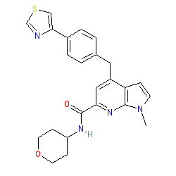 | SMILES | Cn1ccc2c(Cc3ccc(-c4cscn4)cc3)cc(C(=O)NC3CCOCC3)nc21 |