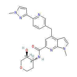 | SMILES | Cn1ccc(-c2ccc(Cc3cc(C(=O)N[C@@H]4CCOC[C@H]4O)nc4c3ccn4C)cn2)n1 |
