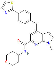 | SMILES | Cn1ccc2c(Cc3ccc(-c4nccs4)cc3)cc(C(=O)NC3CCOCC3)nc21 |