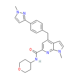 | SMILES | Cn1ccc(-c2ccc(Cc3cc(C(=O)NC4CCOCC4)nc4c3ccn4C)cc2)n1 |