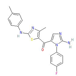 | SMILES | Cc1ccc(Nc2nc(C)c(C(=O)c3cnc(N)n3-c3ccc(F)cc3)s2)cc1 |