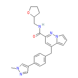 | SMILES | Cn1cc(-c2ccc(Cc3cc(C(=O)NCC4CCCO4)nn4cccc34)cc2)cn1 |