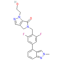 | SMILES | Cn1cc2c(-c3cc(F)c(CN4Cc5cnn(CCO)c5C4=O)c(F)c3)cccc2n1 |