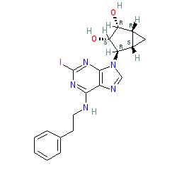 | SMILES | O[C@@H]1[C@H](O)[C@@H]2C[C@@H]2[C@H]1n1cnc2c(NCCc3ccccc3)nc(I)nc21 |