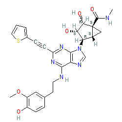 | SMILES | CNC(=O)[C@@]12C[C@@H]1[C@@H](n1cnc3c(NCCc4ccc(O)c(OC)c4)nc(C#Cc4cccs4)nc31)[C@H](O)[C@@H]2O |