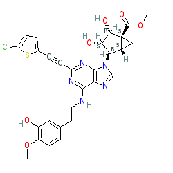 | SMILES | CCOC(=O)[C@@]12C[C@@H]1[C@@H](n1cnc3c(NCCc4ccc(OC)c(O)c4)nc(C#Cc4ccc(Cl)s4)nc31)[C@H](O)[C@@H]2O |