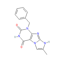 | SMILES | Cc1cn2c(nc3c2c(=O)[nH]c(=O)n3Cc2ccccc2)[nH]1 |