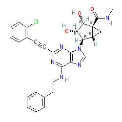 | SMILES | CNC(=O)[C@@]12C[C@@H]1[C@@H](n1cnc3c(NCCc4ccccc4)nc(C#Cc4ccccc4Cl)nc31)[C@H](O)[C@@H]2O |