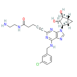 | SMILES | NCCNC(=O)CCC#Cc1nc(NCc2cccc(Cl)c2)c2ncn([C@H]3[C@H](O)[C@H](O)[C@@H]4C[C@@H]43)c2n1 |