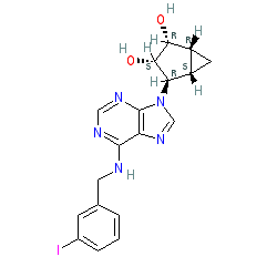| SMILES | O[C@@H]1[C@H](O)[C@@H]2C[C@@H]2[C@H]1n1cnc2c(NCc3cccc(I)c3)ncnc21 |