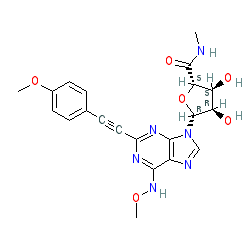 | SMILES | CNC(=O)[C@H]1O[C@@H](n2cnc3c(NOC)nc(C#Cc4ccc(OC)cc4)nc32)[C@H](O)[C@@H]1O |