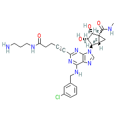 | SMILES | CNC(=O)[C@]12C[C@@H]1[C@@H](n1cnc3c(NCc4cccc(Cl)c4)nc(C#CCCC(=O)NCCCN)nc31)[C@H](O)[C@@H]2O |