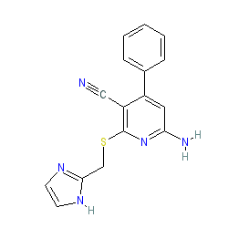| SMILES | N#Cc1c(-c2ccccc2)cc(N)nc1SCc1ncc[nH]1 |