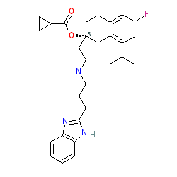 | SMILES | CC(C)c1cc(F)cc2c1C[C@](CCN(C)CCCc1nc3ccccc3[nH]1)(OC(=O)C1CC1)CC2 |