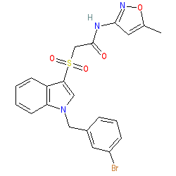 | SMILES | Cc1cc(NC(=O)CS(=O)(=O)c2cn(Cc3cccc(Br)c3)c3ccccc23)no1 |