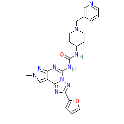 | SMILES | Cn1cc2c(nc(NC(=O)NC3CCN(Cc4cccnc4)CC3)n3nc(-c4ccco4)nc23)n1 |