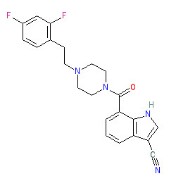 | SMILES | N#Cc1c[nH]c2c(C(=O)N3CCN(CCc4ccc(F)cc4F)CC3)cccc12 |