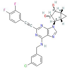 | SMILES | O[C@@H]1[C@H](O)[C@@H]2C[C@@H]2[C@H]1n1cnc2c(NCc3cccc(Cl)c3)nc(C#Cc3ccc(F)c(F)c3)nc21 |