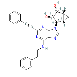 | SMILES | O[C@@H]1[C@H](O)[C@@H]2C[C@@H]2[C@H]1n1cnc2c(NCCc3ccccc3)nc(C#Cc3ccccc3)nc21 |