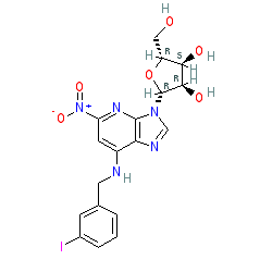 | SMILES | O=[N+]([O-])c1cc(NCc2cccc(I)c2)c2ncn([C@@H]3O[C@H](CO)[C@@H](O)[C@H]3O)c2n1 |