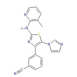 | SMILES | Cc1cccnc1Nc1nc(-c2cccc(C#N)c2)c(-n2ccnc2)s1 |