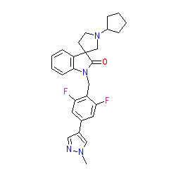 | SMILES | Cn1cc(-c2cc(F)c(CN3C(=O)C4(CCN(C5CCCC5)C4)c4ccccc43)c(F)c2)cn1 |