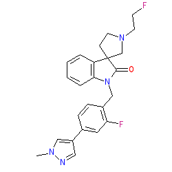 | SMILES | Cn1cc(-c2ccc(CN3C(=O)C4(CCN(CCF)C4)c4ccccc43)c(F)c2)cn1 |