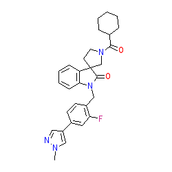 | SMILES | Cn1cc(-c2ccc(CN3C(=O)C4(CCN(C(=O)C5CCCCC5)C4)c4ccccc43)c(F)c2)cn1 |