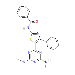 | SMILES | CN(C)c1nc(N)nc(-c2sc(NC(=O)c3ccccc3)nc2-c2ccccc2)n1 |
