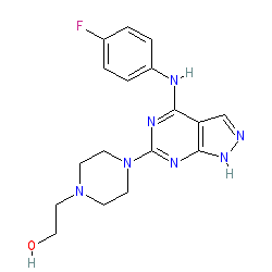| SMILES | OCCN1CCN(c2nc(Nc3ccc(F)cc3)c3cn[nH]c3n2)CC1 |