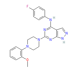 | SMILES | COc1ccccc1N1CCN(c2nc(Nc3ccc(F)cc3)c3cn[nH]c3n2)CC1 |