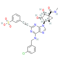 | SMILES | CNC(=O)[C@@]12C[C@@H]1[C@@H](n1cnc3c(NCc4cccc(Cl)c4)nc(C#Cc4cccc(S(=O)(=O)O)c4)nc31)[C@H](O)[C@@H]2O |